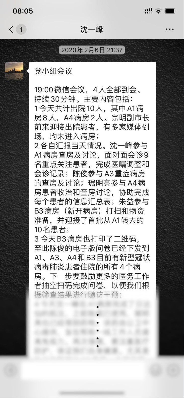 2月3日,临时党小组的工作即有序开展起来。党小组经讨论后,推荐药物临床试验机构办公室主任沈一峰(24年党龄、副主任医师)担任小组长。大家首先明确自身定位,我们精神科医生不是收治患者的主力军,而是“友军”、是帮助者,要尽快熟悉了解大家的需求愿望,适时开展一些小讲课。由于每人负责一个病房的心理干预工作,四人分散在各病房,日常工作中难以见面,故坚持每晚7点进行党小组微信会议(迄今已14次)。通过小组会议,组织跟进学习有关疫情防控相关通知,互相交流每日援助工作进展,分享经验体会,探讨遇到的问题,商议后续工作。每日会议纪要及时反馈给党办,方便后方在第一时间掌握疫情防治一线人员的工作生活情况和身心健康情况。期间,琚明亮医生再次向党组织递交了入党申请。