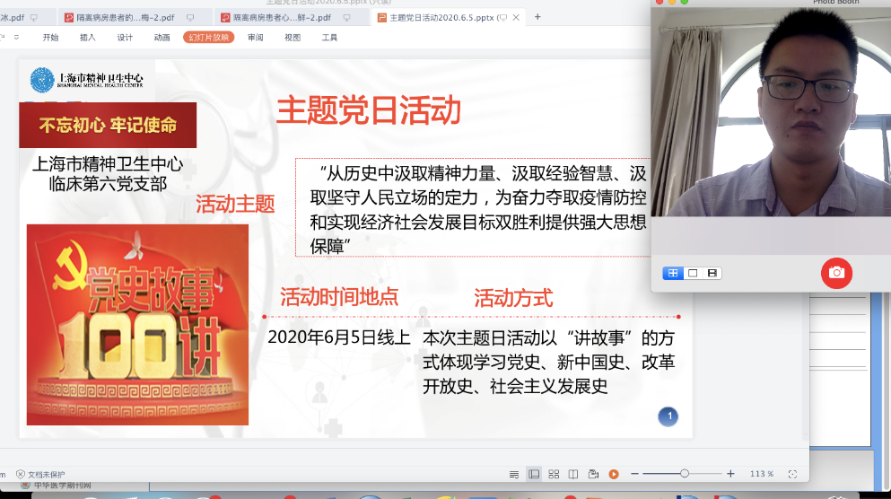 走深走实,丰富学习形式。临床六支部举办线上故事会,每位党员以讲故事的形式结合自身及当前工作畅谈所思所想,仍在抗击疫情第一线的琚明亮医师在隔离病房参加线上支部活动,与支部党员一起学史说史。医技一支部组织党员诵读《中华人民共和国简史》部分章节,认真学习新中国成立和社会主义基本制度的确立等相关内容。研究所二支部组织“四史”知识竞答,进一步激发党员学习“四史”的积极性,不断提高党性修养。科教支部组织观看《人间世·抗击疫情特别节目》第二集《相逢》,纪录片真实展现援鄂医务人员在武汉的种种珍贵相遇,其中较大篇幅介绍中心彭代辉主任在武汉开展心理治疗的艰辛及成效,医护人员全面参与疫情防控斗争,以实际行动守初心、担使命的感人故事触动了每一位党员。机关三支部、医技二支部、后勤二支部通过上海党员干部现代远程教育互联网平台观看《理想火种》、《红色起点》视频,党员们从尘封的历史往事中,了解上海作为中国革命和红色文化源头的缘由。临床五支部组织党员、入党积极分子参观四行仓库抗战纪念馆,寻访抗战历史印记,传承红色革命精神,推进“四史”学习教育走向深入。