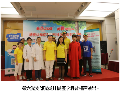 我们的“从ʻ心ʼ开始,关爱老年人”科普志愿者活动,在国内首创全新科普形式——科普相声及为社区居民演出。2016年12月,项目组举办的“科普嘉年华”,推出科普相声《老糊涂》,在欢乐的气氛里,向大家科普了2个关键知识:阿尔茨海默病的患者的认知功能是逐渐下降的;照顾患者,需要家属足够的耐心。本支部还联手上海交通大学医学院相声协会的“医”笑解忧团队,将专业的AD防治医学知识转化成相声语言艺术,让听众在欢声笑语中了解AD防治医学知识。