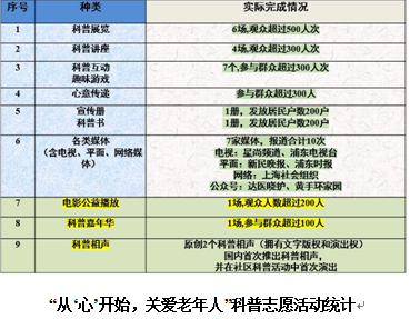 截至目前,在“从ʻ心ʼ开始,关爱老年人”科普志愿者中,第六党支部共计为塘桥社区居民提供健康科普讲座4场、播放公益科普电影1场、互动趣味游戏13次、心意传递活动300多人次、累计发放相关宣传资料400多份。参与的党员累计共达100多人次,志愿服务总时数300小时。该活动受到居民们广泛好评,有近95%的居民认为这些志愿活动整体效果满意或基本满意,近97%的居民认为志愿活动大大增加或基本增加了自身对于心理疾病及如何防治的了解,90%的居民认为这些志愿活动的意义在于宣传心理疾病相关知识,让人及时预防的同时,也可以帮助真正的患者和家庭。引起了社会广泛关注,发挥了良好社会效用。