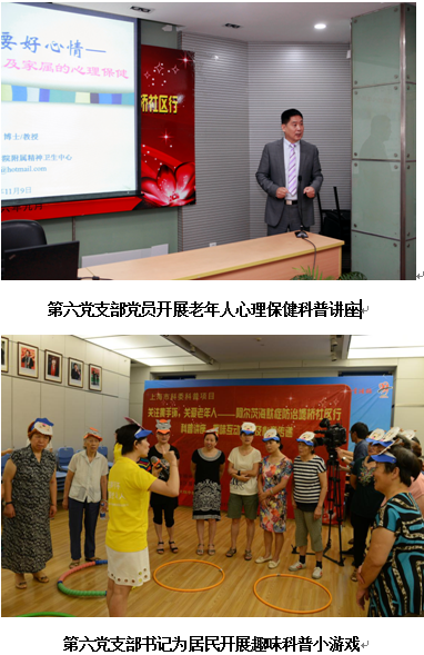 基于支部优势,我们确立了针对老龄化社区,积极为社区内老年人提供心理健康知识和心理疾病的科普工作——这一服务内容。我们秉承“奉献、友爱、互助、进步”的志愿者精神,积极响应基层党组织“三会一课”的创新工作,积极响应习总书记“建设健康中国,增进人民福祉”的重要讲话,关注老龄化社会需求,以“从‘心’开始,关爱老年人”为品牌,发挥自身优势,以志愿者形式参与上海社区老龄化疾病的防治工作。