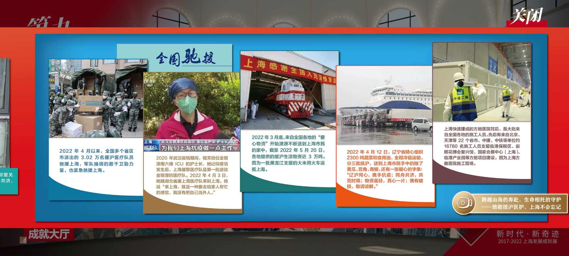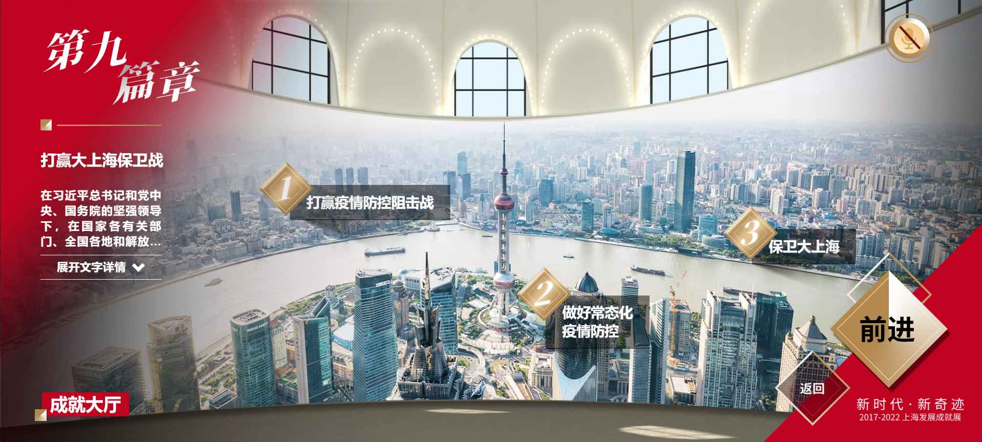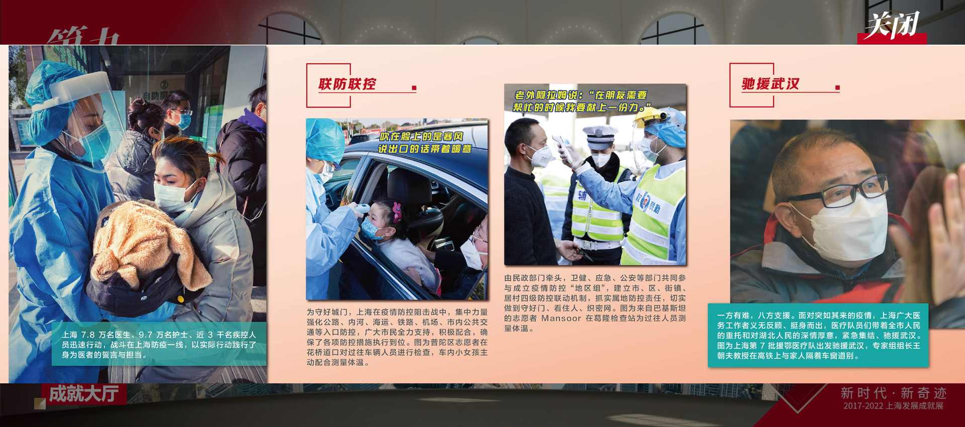 其中最令我动容的,是第九篇章“大上海保卫战取得重大阶段性成果”。这一篇章以三个部分展现了上海在新冠疫情肆虐以来全市党员干部和市民群众,付出艰苦卓绝的努力,打赢了大上海保卫战。第一部分展现了2020年以来,上海市通过“科学救治”、“联防联控”以及“驰援武汉”等形式打赢了疫情防控狙击战;第二部分是疫情防控转入常态化后,上海坚决贯彻“外防输入、内防反弹”的总策略,始终坚守国门,为疫情条件下,畅通国内外经济循环与人员往来做出来巨大贡献;最后是“大上海保卫战”,2022年3月以来,面对空前严峻复杂的疫情,在中央党委、上海市党委带领下,全国各地和人民军队的大力支持,上海市人民团结一心、众志成城历经了66天,终于打赢了上海保卫战。