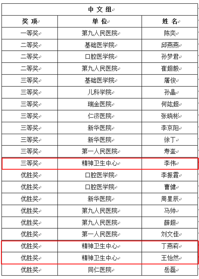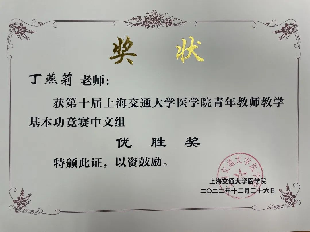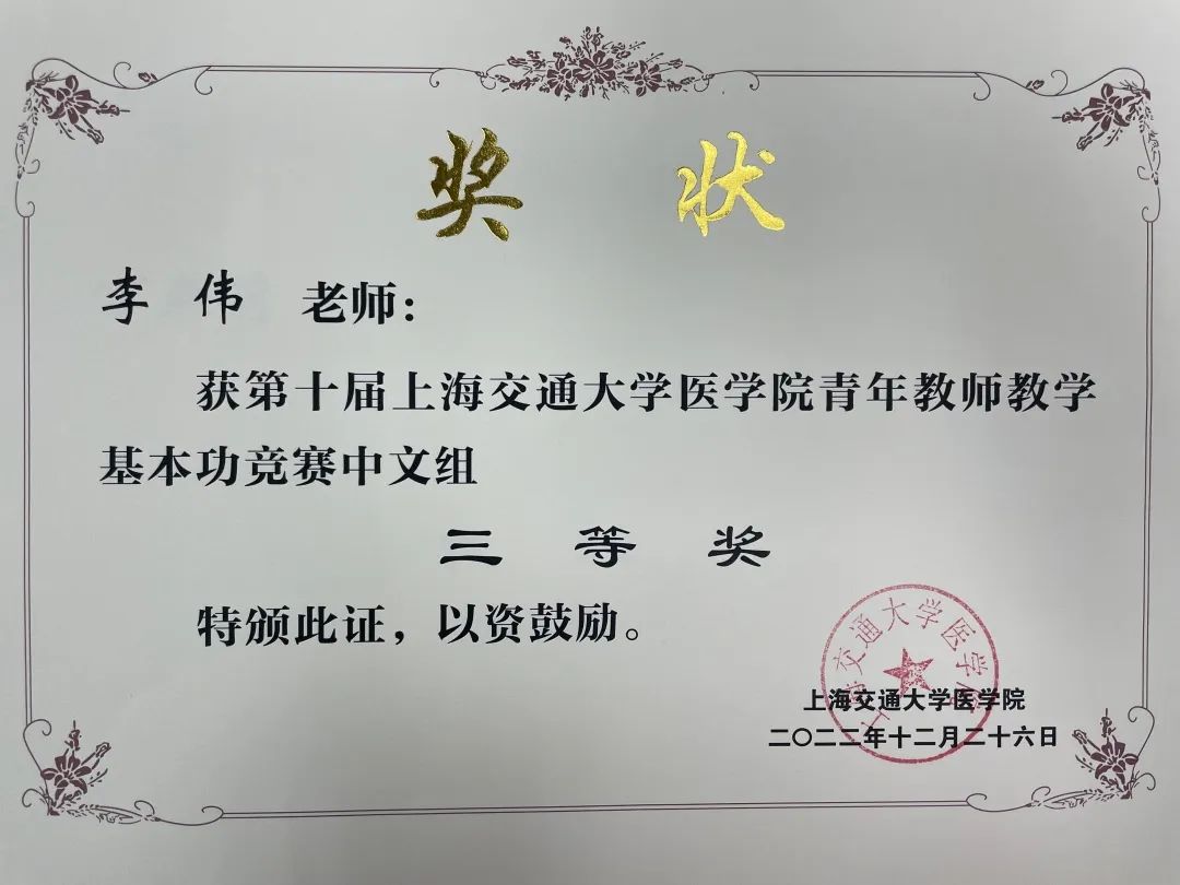 最终,在去年年底的医学院青教赛决赛中,李伟获得了中文组三等奖的好成绩,丁燕莉及王怡然获得了中文组优胜奖,取得了突破性的佳绩。