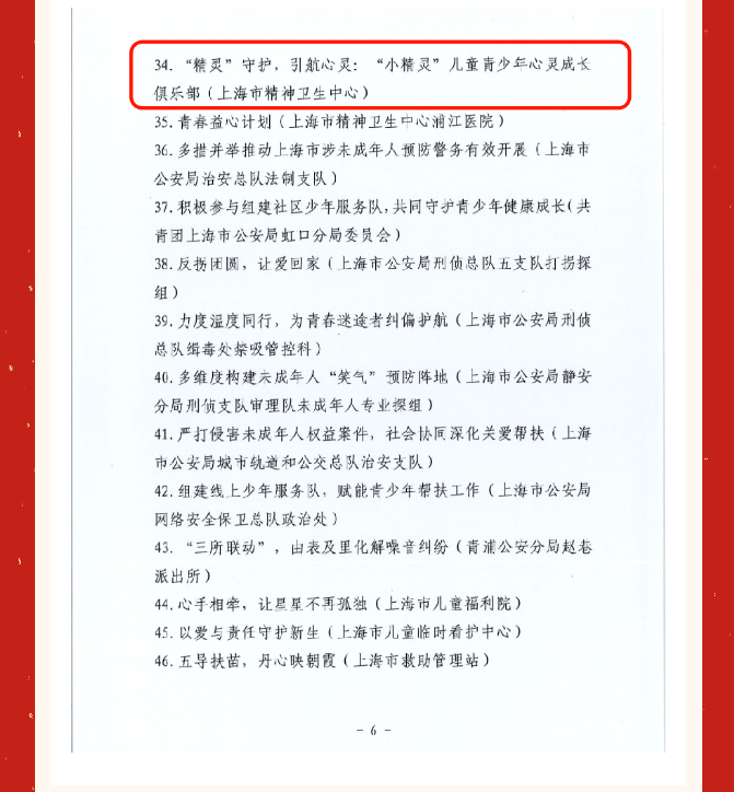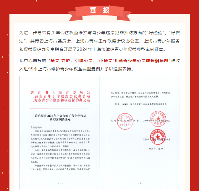 喜 报 | 我中心“小精灵”儿童青少年心灵成长俱乐部荣获2024年上海市维护青少年权益典型案例
