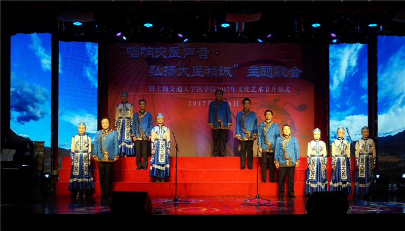 4月6日,上海交通大学医学院“唱响交医精神,弘扬大医精诚”主题歌会在懿德楼三楼报告厅举行,中心闵行院区程呈斌、吴昳雯、柏忠生、何佩、陈杰、朱安玺、徐庆华、张轶聪、凌冬、闵茗、陈开元、奚雪春、胥杰、刘佳丽等14位队员组成“精心”合唱队,在歌会现场表演了极具民族风情的歌曲《天边》,来自草原的天籁深情,多声部的浑然一体,仿佛山涧里流淌的溪水沁人心脾,收获现场观众的热烈掌声!而此时队员们紧张的心情才慢慢轻松下来,一个月的训练场景又浮现眼前。