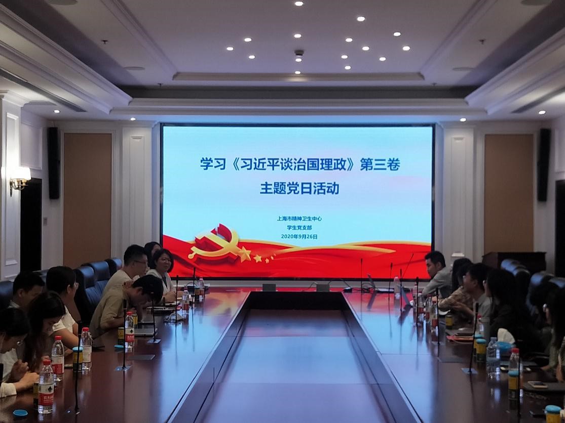 2020年9月26日星期六上午,上海市精神卫生中心学生党支部在徐汇院区2号楼第一会议室举办了“学习《习近平谈治国理政》(第三卷)”党建活动。此次活动是精卫中心学生党支部疫情防控常态化后举办的一次线下党建活...