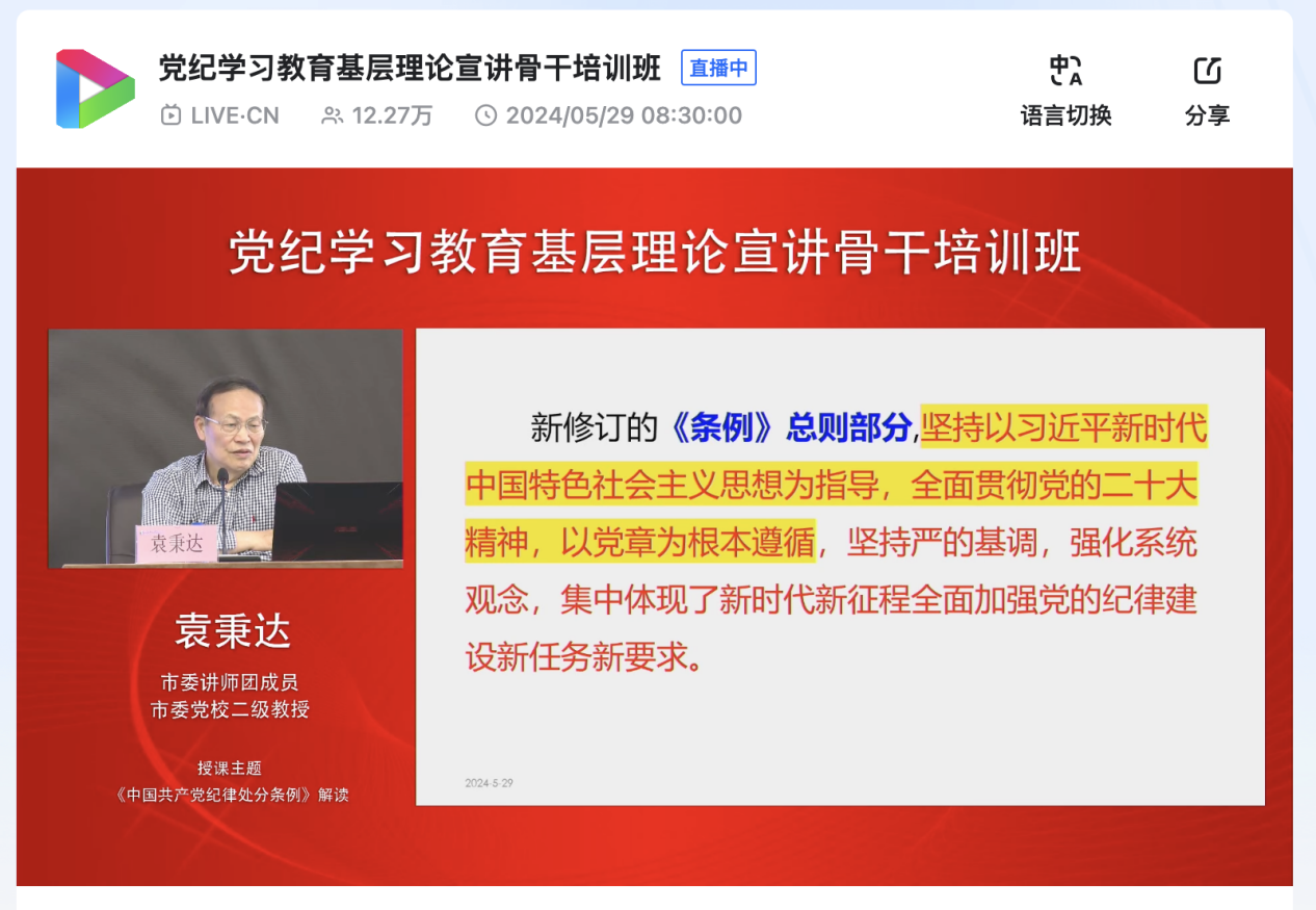 5月29日,根据中心党委党纪学习教育通知,机关一支部组织党员参加上海市委讲师团党纪学习教育基层理论宣讲培训,我在线聆听了《中国共产党纪律处分条例》宣讲。 市委讲师团成员、上海市委党校教授袁秉达结合具体...