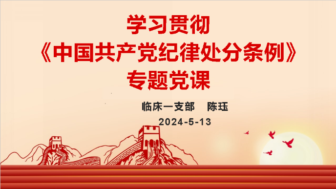 为深入学习贯彻新修订的《中国共产党纪律处分条例》,5月13日临床一支部组织开展专题主题党日活动,支部36名党员全体参加。 首先,在个人自学和党支部书记先学一步、学深一层基础上,支部书记陈珏为大家上“学习...