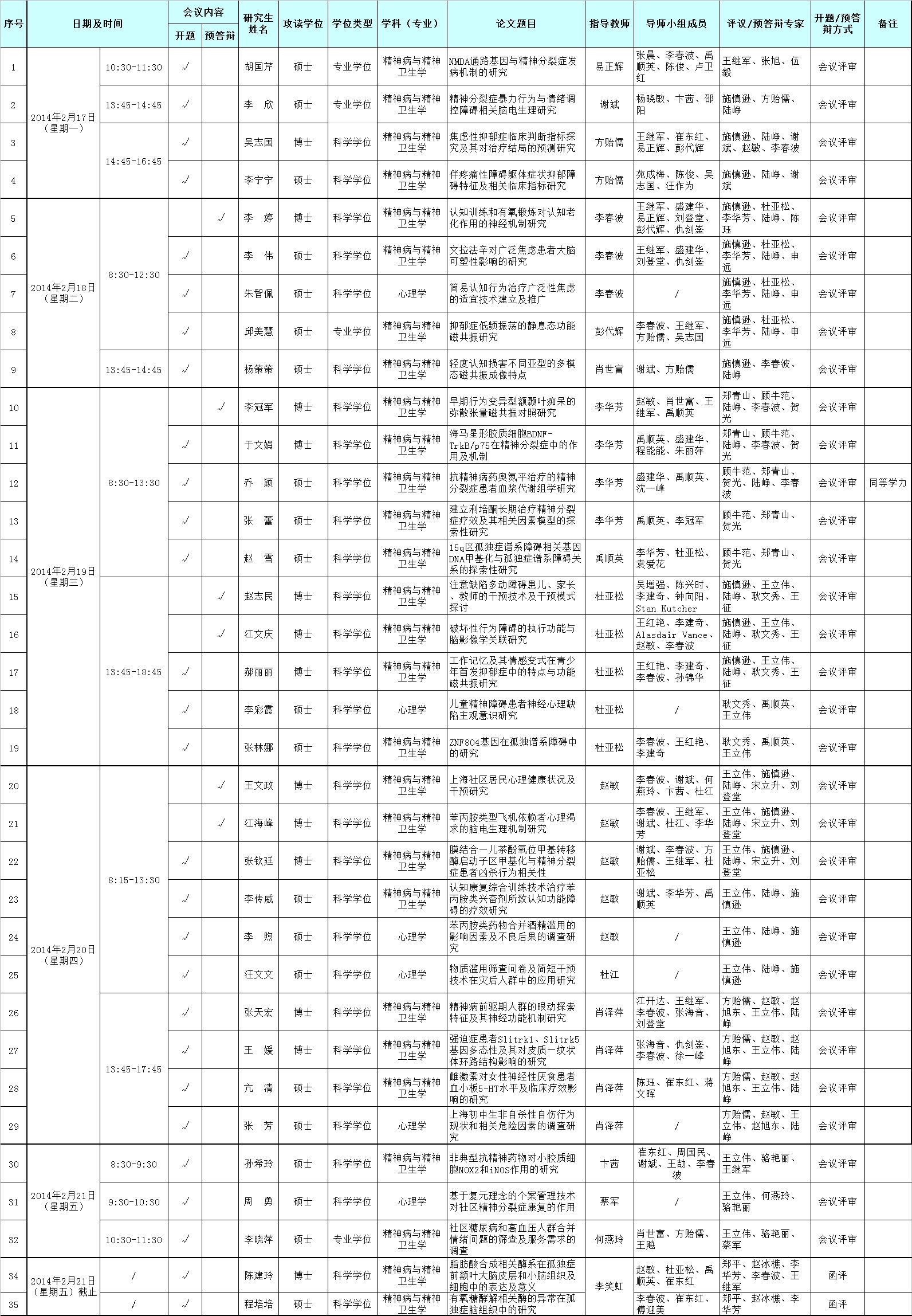 兹定于2014年2月17日—2月21日,在上海市精神卫生中心2号楼5楼第二会议室进行本中心2014年上半年研究生学位论文统一开题及预答辩会议,欢迎各位同道及研究生旁听。