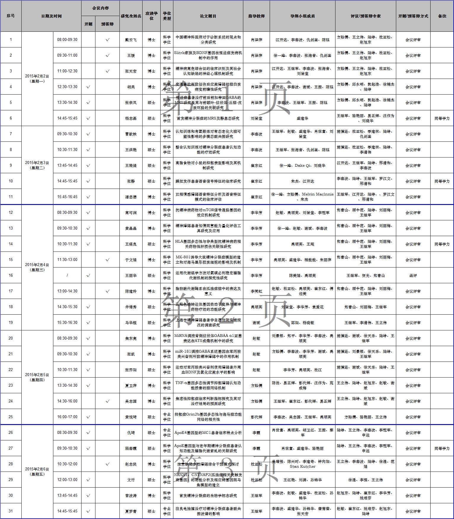 兹定于2015年2月2日—2月6日,在上海市精神卫生中心2号楼5楼第二会议室进行本中心2015年上半年研究生学位论文统一开题及预答辩会议,欢迎各位同道及研究生旁听。