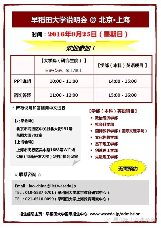 2017年早稻田大学CSC项目招募已经启动,兹定于9月25日举办有关早稻田大学研究生项目的说明会,具体时间地点请见附件。