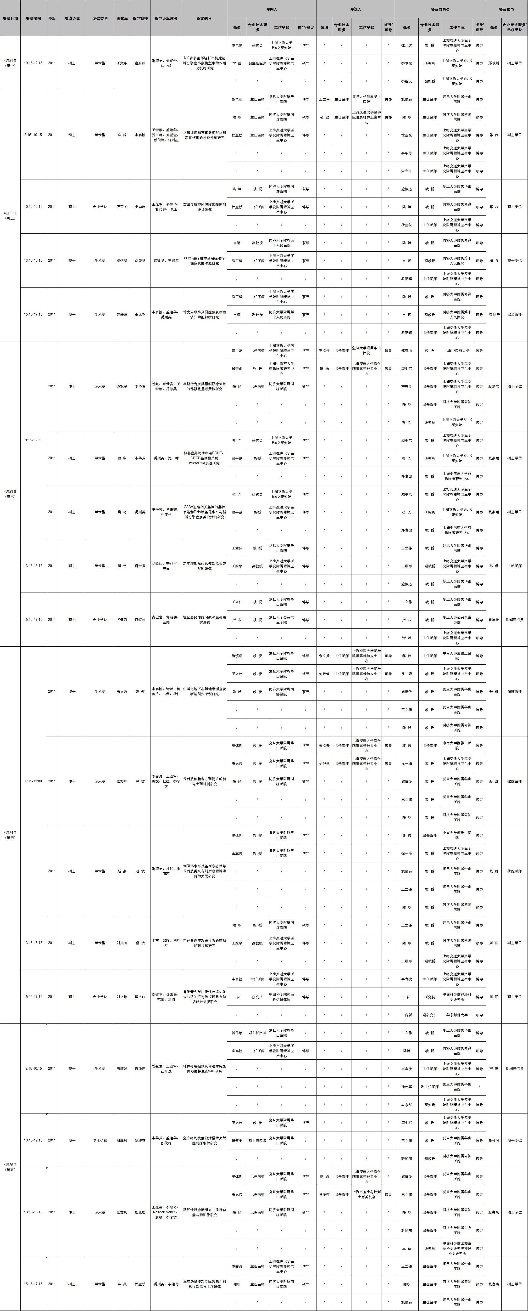 上海交通大学医学院精神病与精神卫生学专业2014年上半年研究生学位论文答辩会议定于2014年4月21日至4月25日,在上海市精神卫生中心2号楼5楼第二会议室进行,欢迎各位同道及学生旁听。