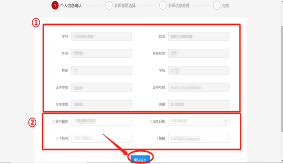 (3)①中为无法修改的信息,②中为可以修改的信息,请同学确认自己信息是否有变更(手机号码如有变更,请务必更新),确认后点击“确认提交”。