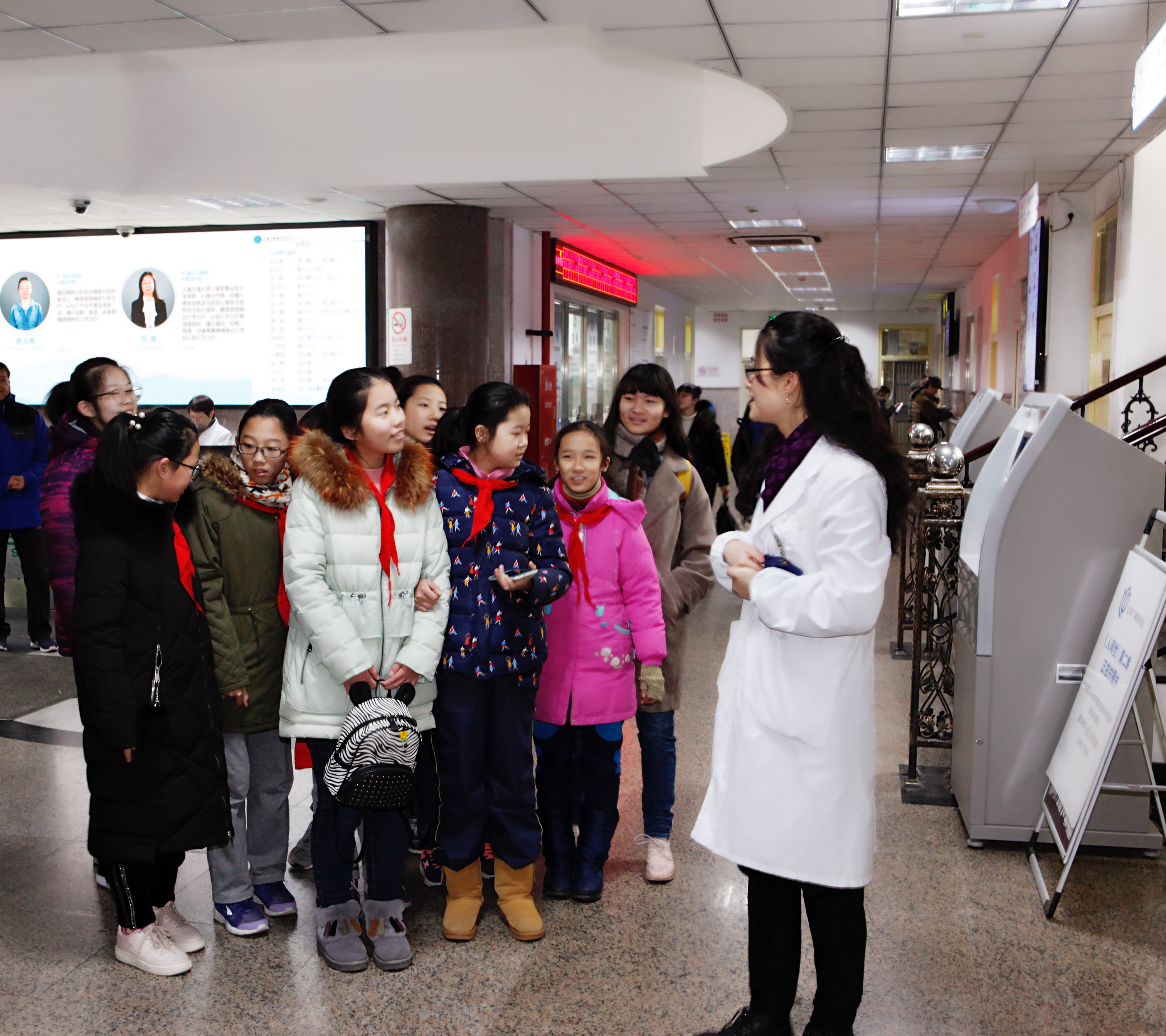 在精神科门诊和儿少科门诊,熙熙攘攘的就诊人群呈现在同学们面前。医生告诉我们,现在网上预约、支付宝挂号等方式为大众提供了非常便利的途径,大厅里面再也不像以前那样拥挤。我们在大厅四周墙上看到有健康宣传的微电影和视频,墙边还放着宣传资料,这可以让大家了解很多精神科的知识。在预检台,我们看到了态度和蔼的护士阿姨和志愿者,听着他们亲切的声音、看着他们忙碌的身影,我们每个人都觉得白衣天使真的很伟大!在心理咨询和治疗中心的儿少科门诊,我们惊奇地发现候诊区域的墙上画着各种各样美丽的图画,儿科诊室里面也有很多儿童的玩具。医生说,这是为了让孩子们在候诊和就诊的时候减少恐惧感。在候诊区,我们也看到了一些小朋友,他们有的在发脾气,有的也用好奇的目光打量我们。我们小队成员都很感慨,心理健康是那么重要,我们都要保持良好的心态!