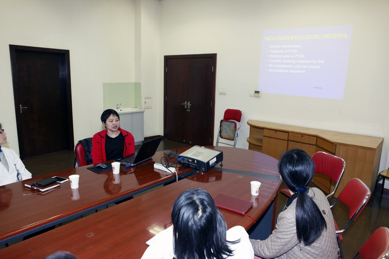 讲座在教学培训楼3楼会议室举行,陆炜丽博士详细地介绍了其在美国开展的研究-《认知行为疗法治疗重度精神病患者的创伤后应激障碍临床随机对照试验(cognitive behavior therapy for post traumatic disorder among persons with serious mental illness: a randomized trial)》,并就研究设计、研究实施中的关键点回答了大家提出的问题。