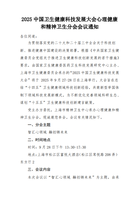 2025 中国卫生健康科技发展大会心理健康和精神卫生分会会议通知