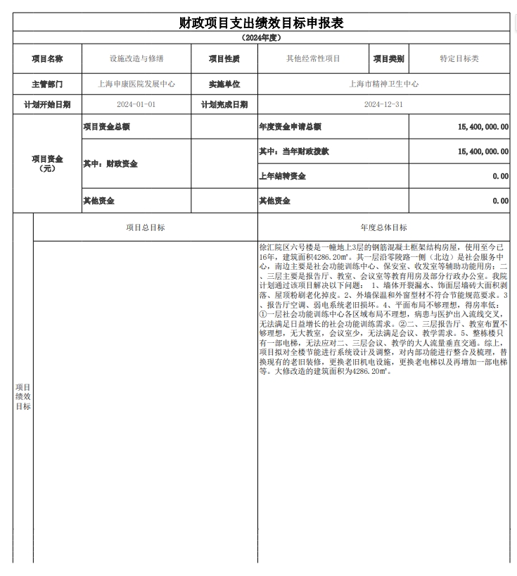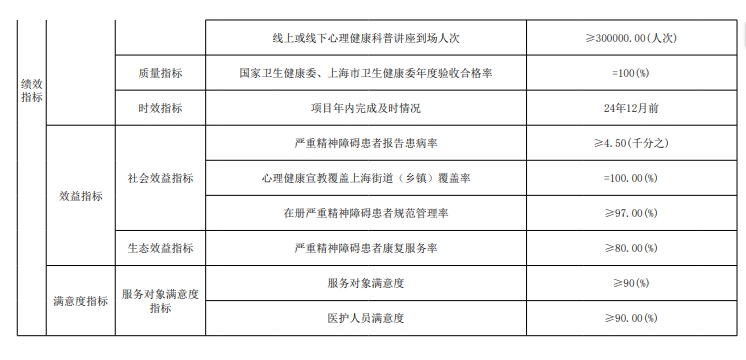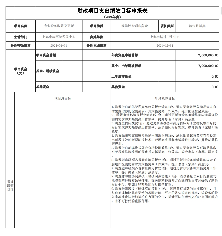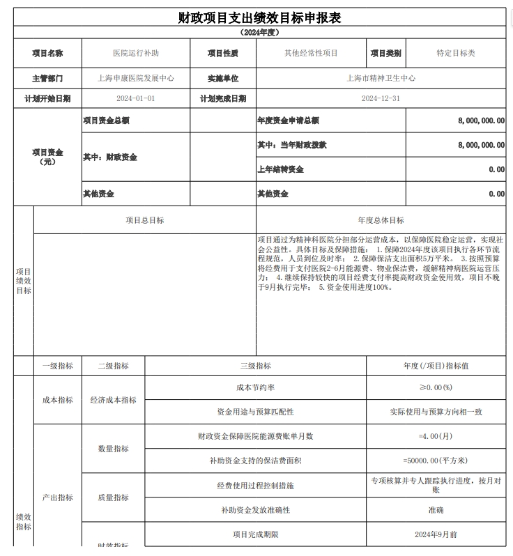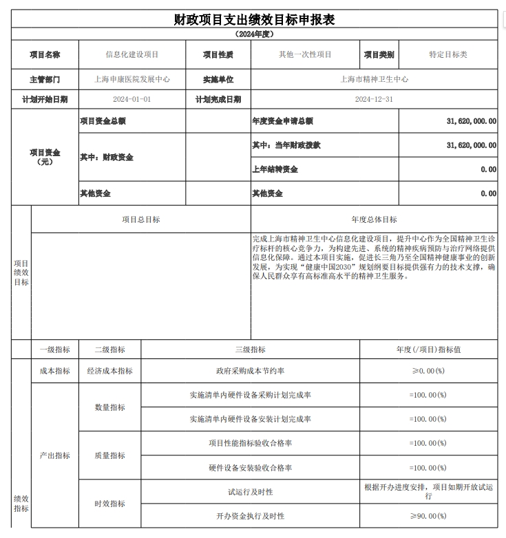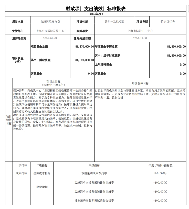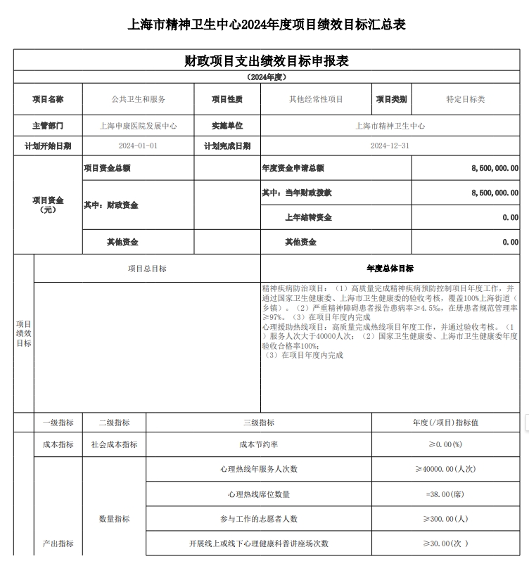上海市精神卫生中心2024年度项目绩效目标汇总表