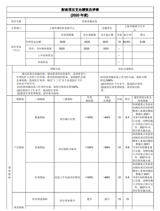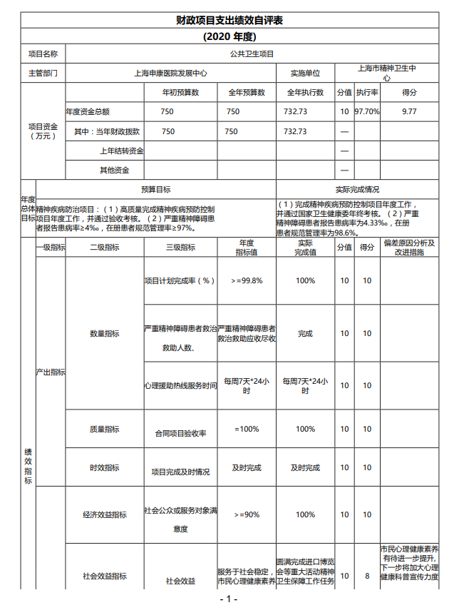 上海市精神卫生中心2020年度项目绩效自评表公开
