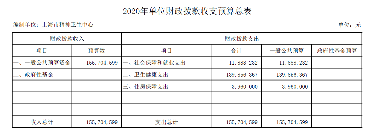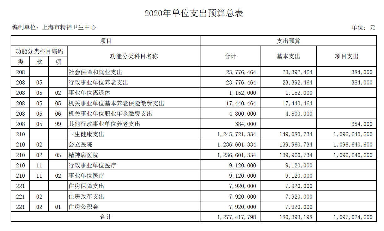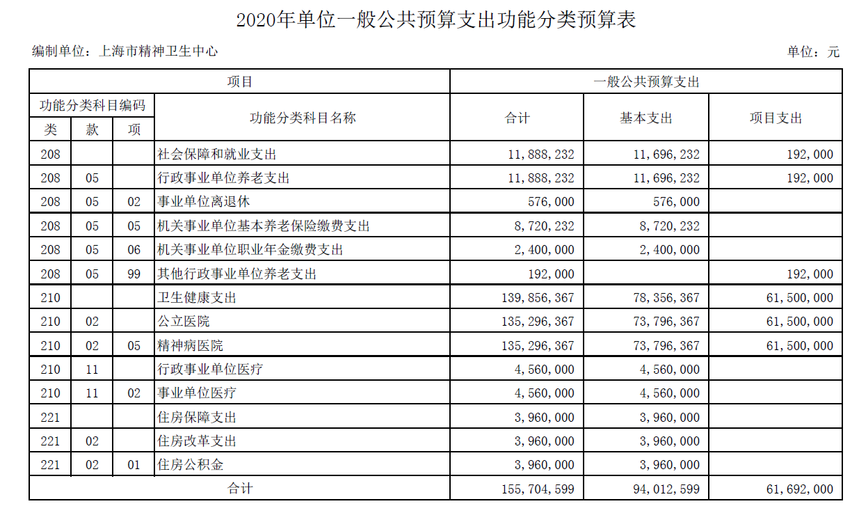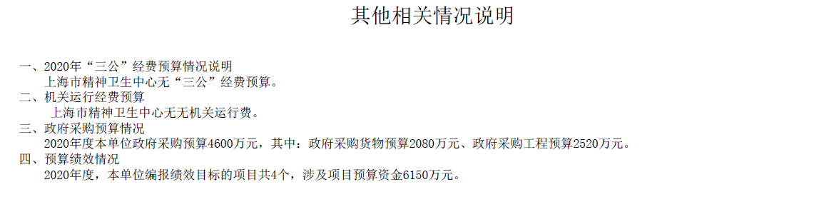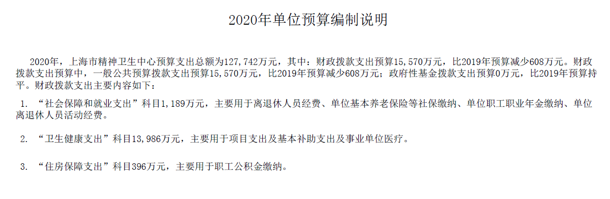 上海市精神卫生中心2020年度财政支出项目绩效目标