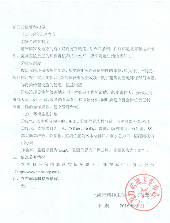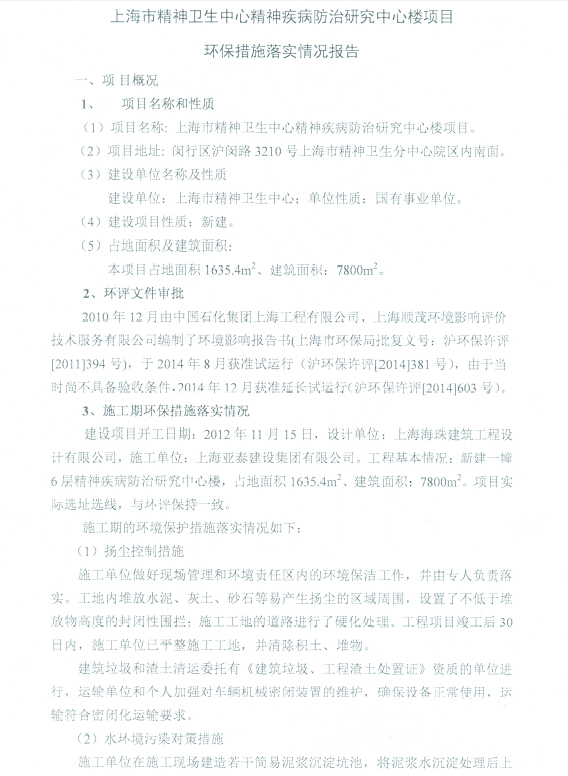 附件:上海市精神卫生中心精神疾病防治研究中心楼项目环保措施落实情况报告