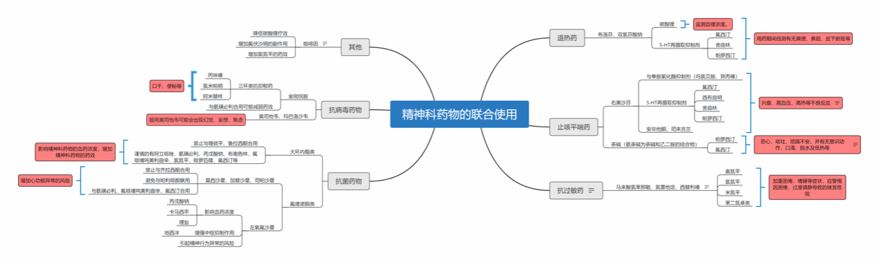 精神类药品与对乙酰氨基酚联用时,由于对乙酰氨基酚主要经肝脏代谢出体外,尤其是长期高剂量的联用会增加肝毒性的风险,因此,两类药物联用时应注意对乙酰氨基酚的安全剂量。许多复方感冒药也含有对乙酰氨基酚,如酚麻美敏、复方氨酚烷胺、氨咖黄敏、维C银翘片、感冒宁胶囊等,使用复方感冒药时需仔细查看说明书中的药品成分,避免重复使用导致对乙酰氨基酚的的用量过大。用药期间应注意观察有无皮肤黄染、腹胀、厌油腻等,若出现及时停药检查。