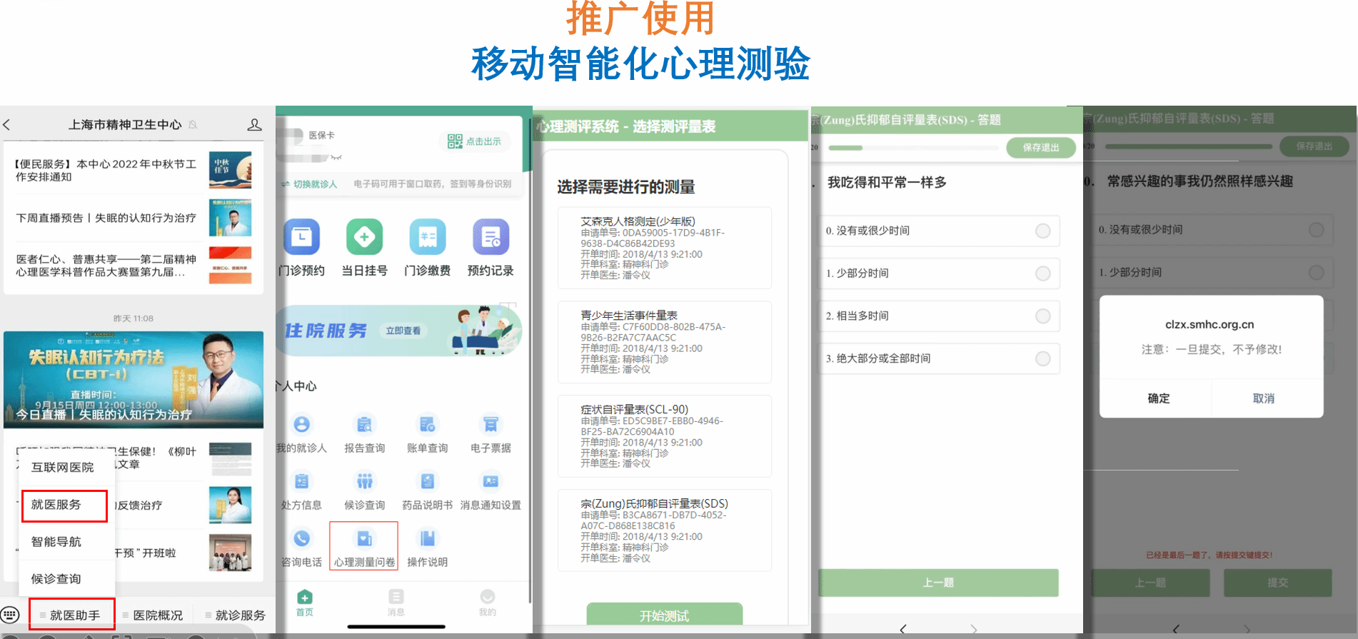 近年来,我们紧跟人工智能时代,充分运用技术方法,推广使用移动智能化心理测验,开展了手机扫码的在线心理测验,优化工作流程,大大缩短了等候时间,从而提高患者满意度,改善患者体验。